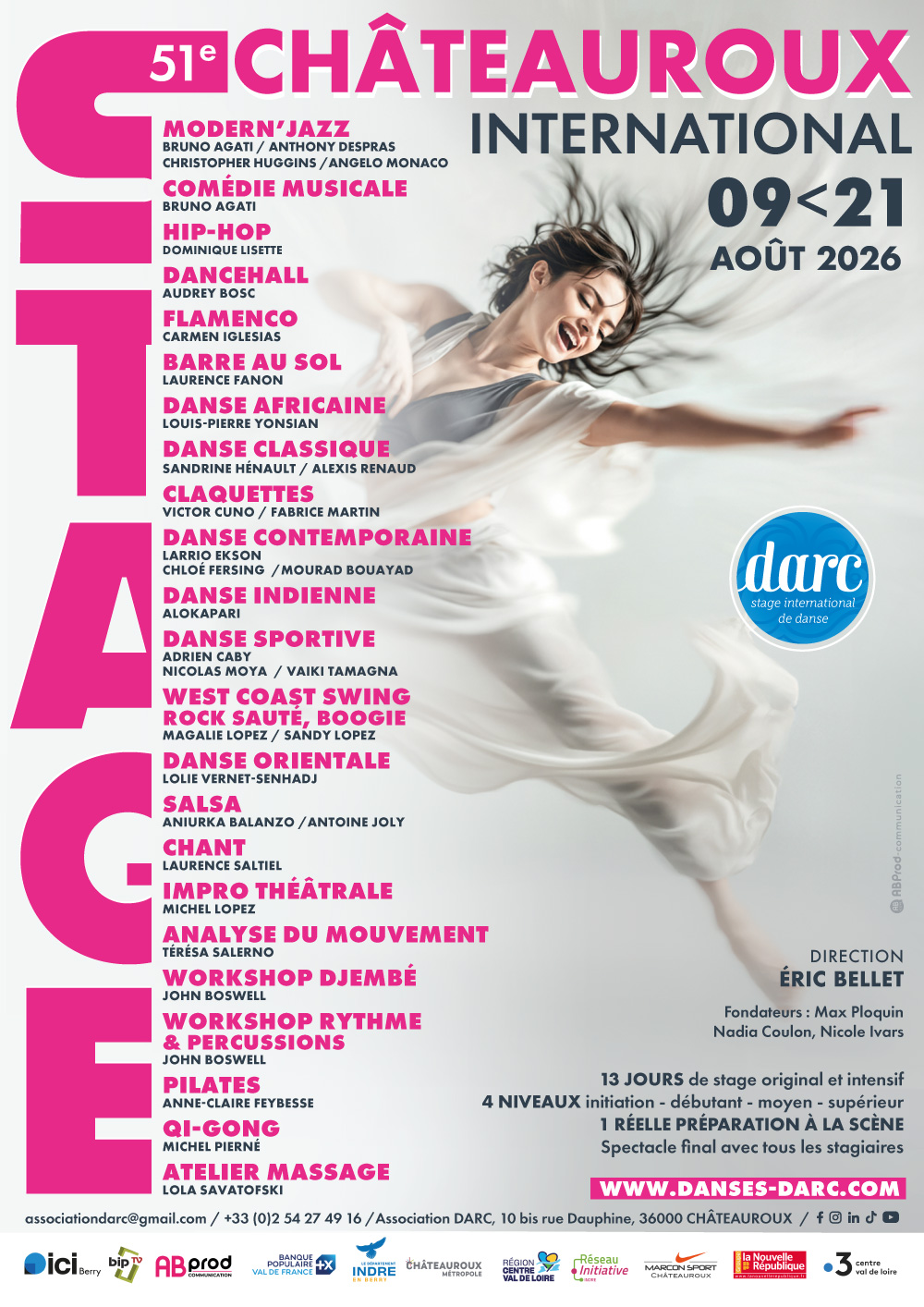 Le Stage-Festival International de Châteauroux-DARC, véritable événement bicéphale, allie un stage de danse, encadré par les professionnels les plus renommés, à des concerts tout public permettant le soir d’associer, entre autres, les habitants du Département de l’Indre et de la Région Centre-Val de