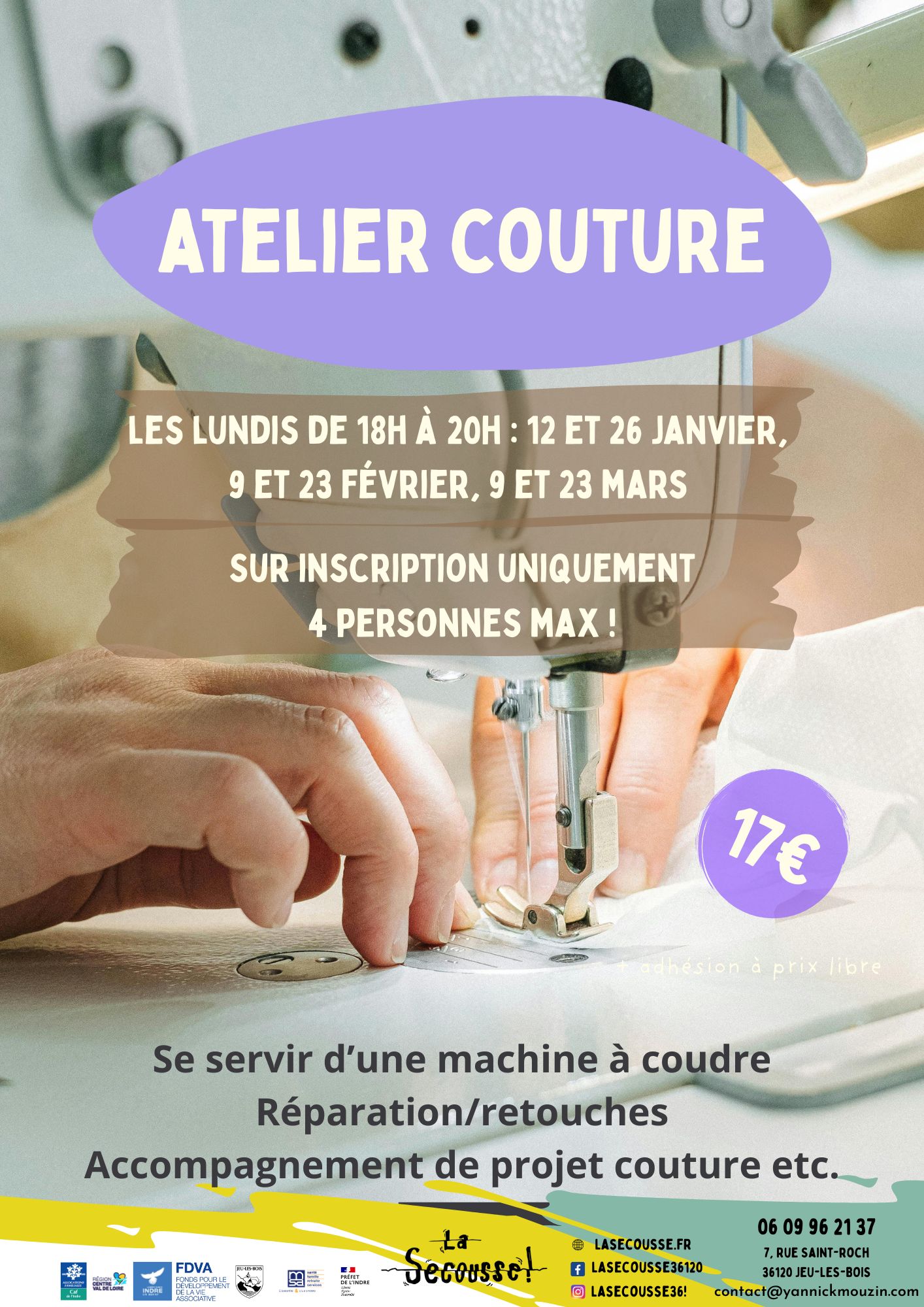 Vous rêvez de vous mettre à la couture, d'apprendre à utiliser votre machine à coudre ou de vous faire accompagner dans un projet ? Cet atelier est fait pour vous ! La Secousse relance ses ateliers couture avec un accompagnement personnalisé proposé par une professionnelle.