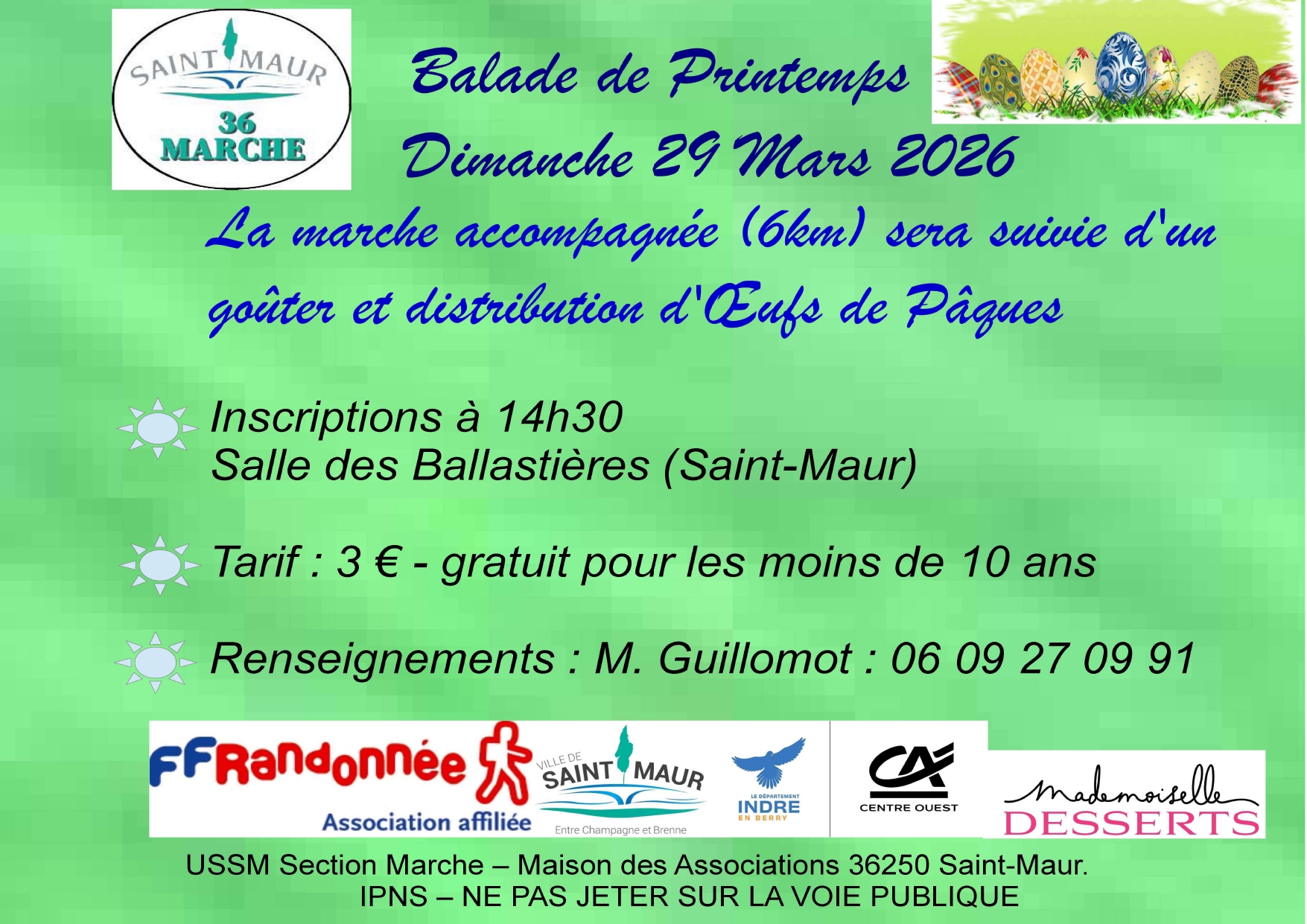 La marche accompagnée (6km) sera suivie d'un goûter et d'une distribution d'œufs de Pâques.
