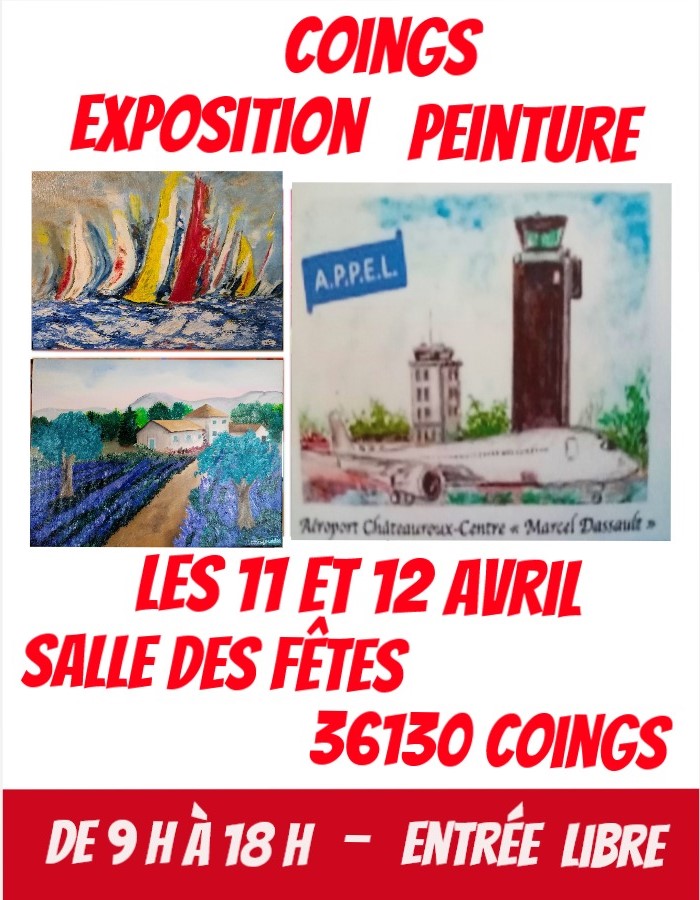 Une exposition d'art et de peinture se déroulera à la salle des fêtes de Coings, où une vingtaine d'artistes présenteront leurs aquarelles, huiles, acryliques et bien d'autres matières, les 11 et 12 avril.
