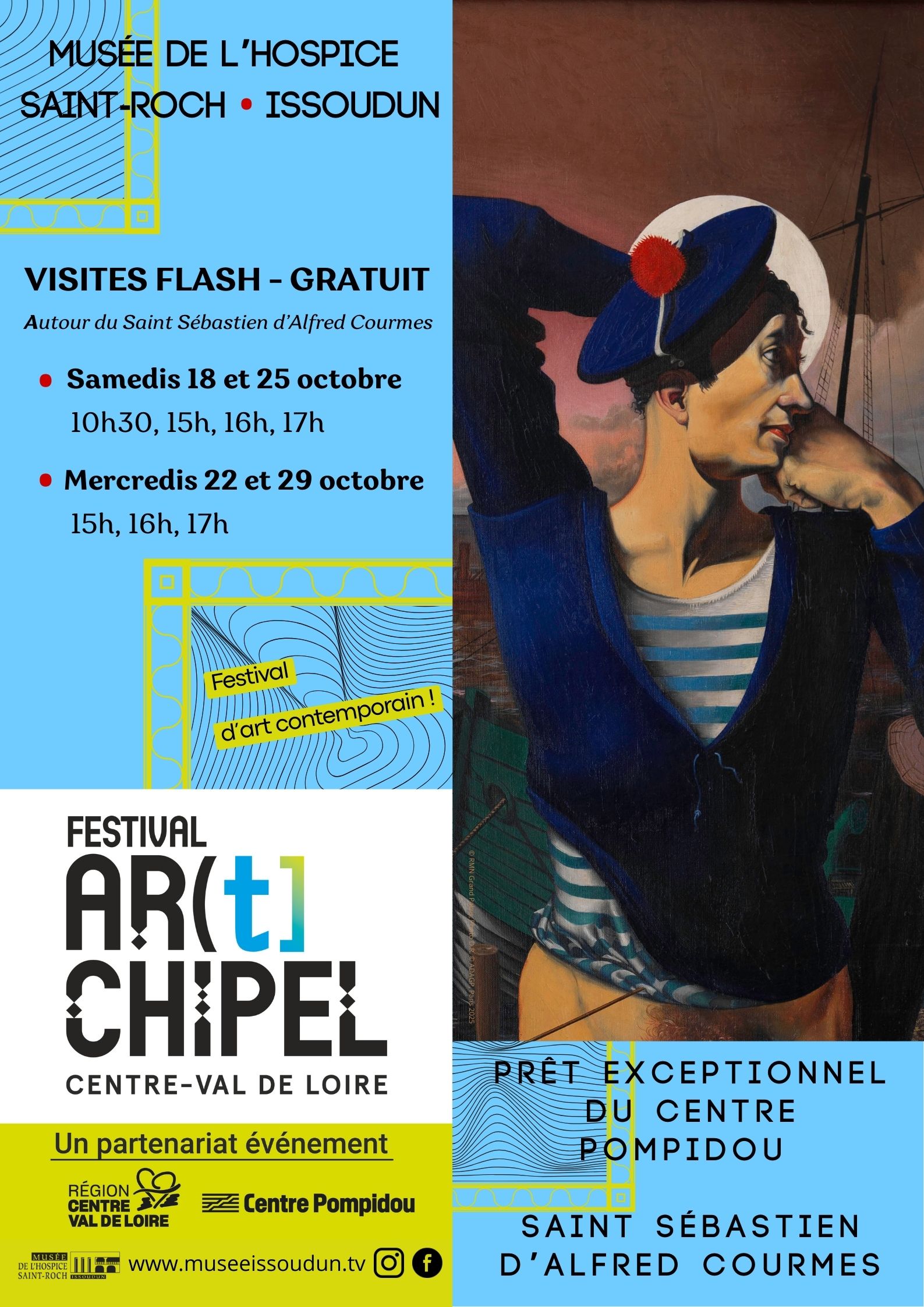 Pour cette édition, le musée expose un prêt exceptionnel du Centre Pompidou, le tableau Saint Sébastien d’Alfred Courmes. Il est le pendant d’une œuvre emblématique du musée représentant Saint Roch du même artiste. Ces deux œuvres, conçues à l’origine pour faire partie d’un triptyque, sont réunies à Issoudun pour la première fois.