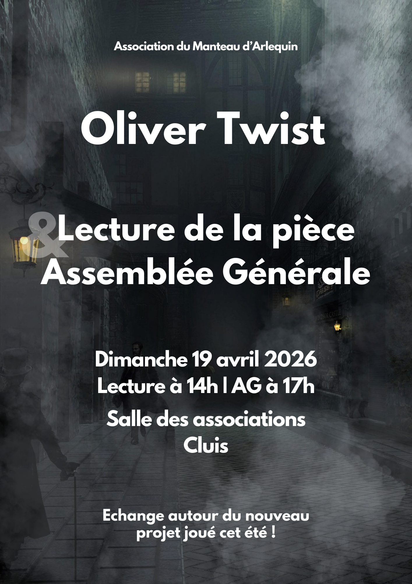 • Présentation du projet Oliver Twist joué du 22 juillet au 1er août 2026 ;