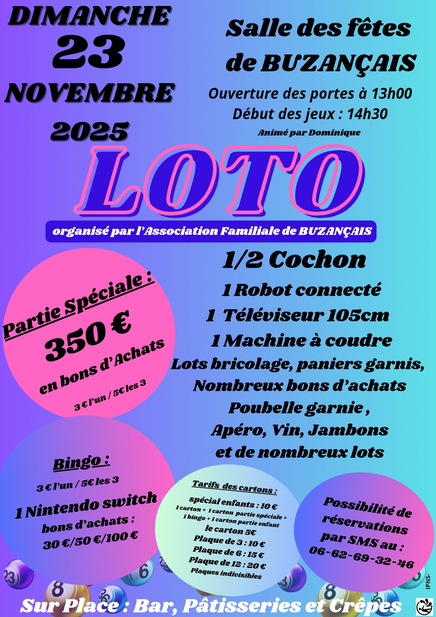 De nombreux lots à gagner : ½ cochon, 1 téléviseur, 1 machine à coudre, des bons d'achats, lots bricolage, paniers garnis, …