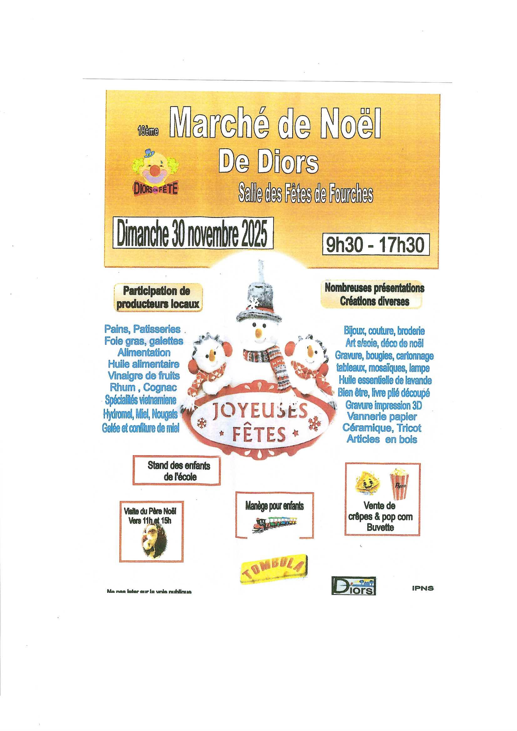 Les bénévoles du Comité des fêtes de DIORS vous convient à leur 19ième marché de Noël qui se déroulera à la salle des fêtes de Fourches Diors le Dimanche 30 Novembre 2025 de 9h30 à 17h30 Vous flânerez parmi une trentaine d’exposants, artisans, créateurs et commerçants. Stand des enfants de l’Ecole primaire de Diors. Le Père Noel fera une visite en fin de matinée et dans l’après-midi. Manège pour les petits. Sur place : stands gourmands, buvette. Un moment convivial à partager en famille ou entre amis !!