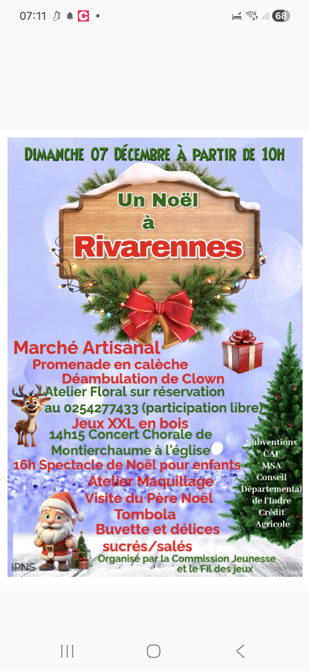 Marché artisanal, animations gratuites telles que des promenades en calèche, maquillage enfant, spectacle de Noël pour les enfants, clowns déambulateurs, atelier floral, concert en l'église avec la chorale de Montierchaume, visite du Père Noël Buvette et restauration salée et sucrée.