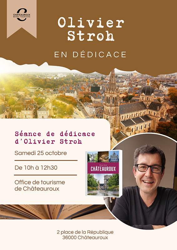 L’Office de Tourisme de Châteauroux a le plaisir d’accueillir Olivier Stroh le samedi 25 octobre de 10h à 12h30 pour une séance de dédicaces de son nouvel ouvrage « Châteauroux ».