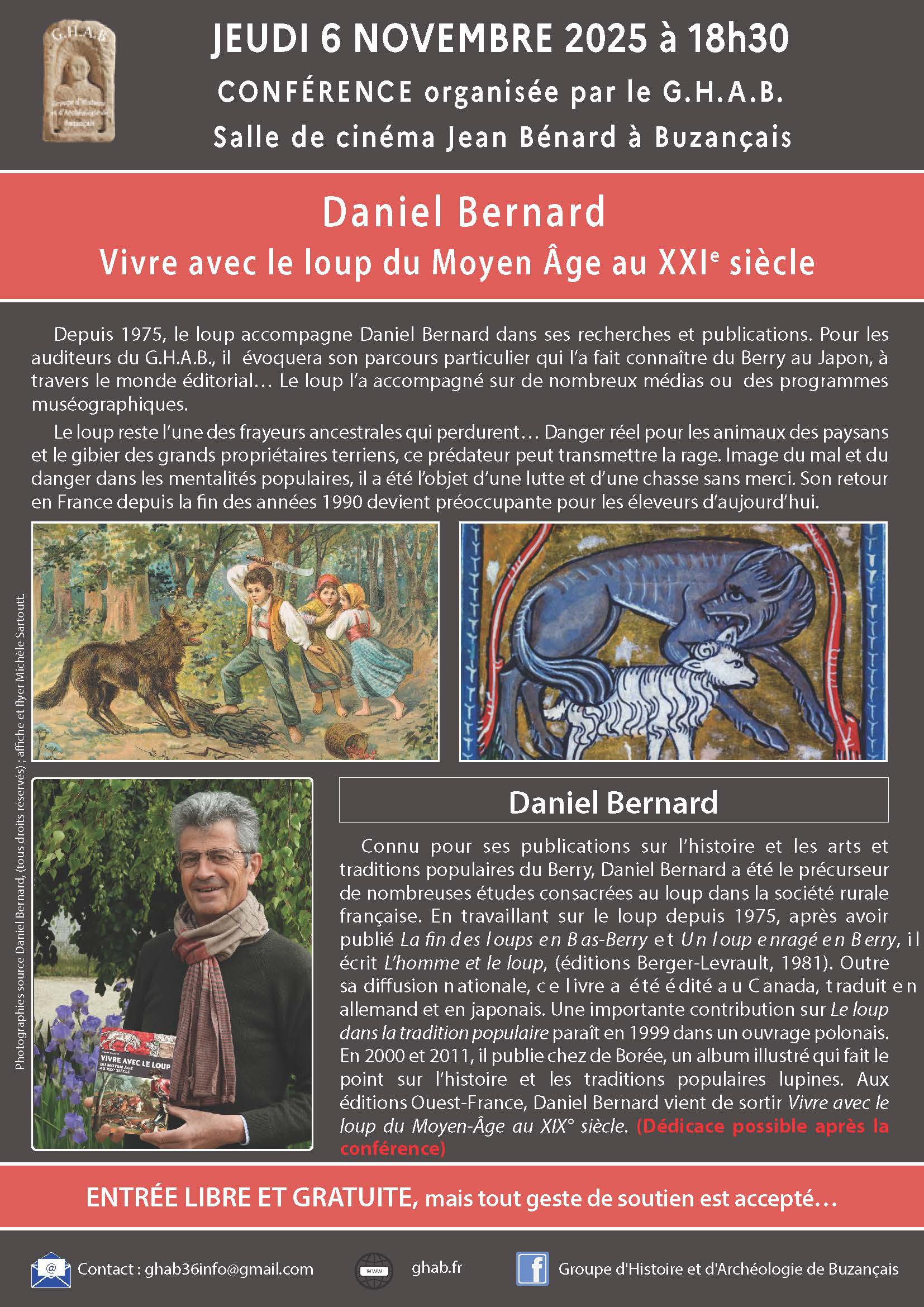 Depuis 1975, le loup accompagne Daniel Bernard dans ses recherches et publications. Pour les auditeurs du G.H.A.B., il évoquera son parcours particulier qui l’a fait connaître du Berry au Japon, à travers le monde éditorial… Le loup l’a accompagné sur de nombreux médias ou des programmes muséographiques.