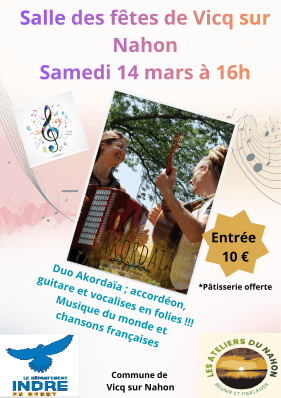 Musiques du Monde par le DUO Guitare Accordéon AKORDAIA Concert, Danse Lieu : Vicq-sur-Nahon Le 14 mars 2026